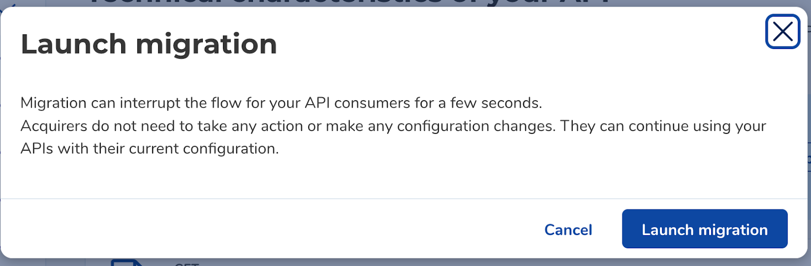 A final warning informs you that your data acquirers may experience a service interruption of a few seconds, but will not have any manipulation to perform to continue consuming the acquired APIs.